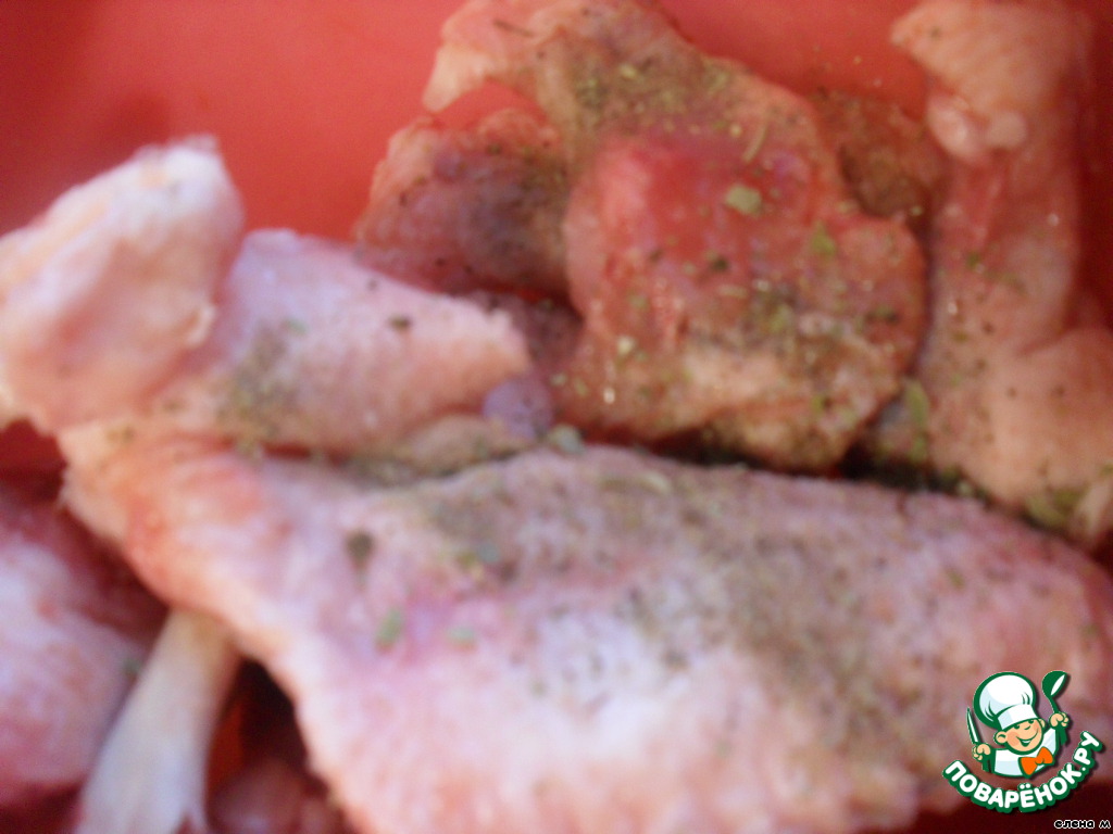 Куриные крылья посыпаем перцем, петрушкой и солью.