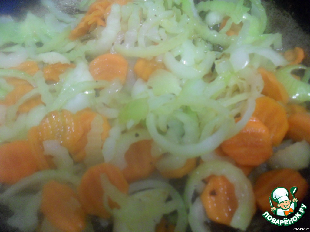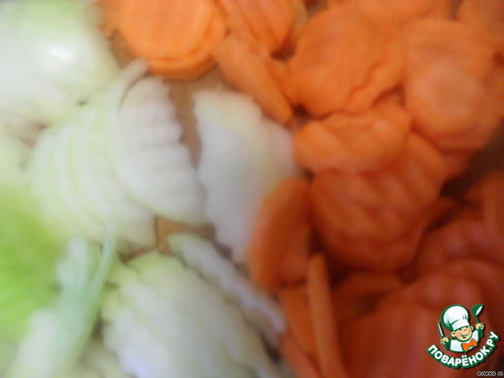 Нарезаем морковь кружочками или половинками кружков, лук четвертинками колец.