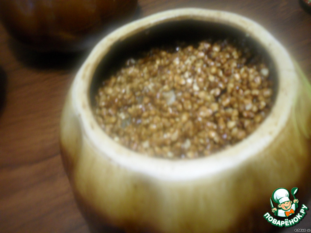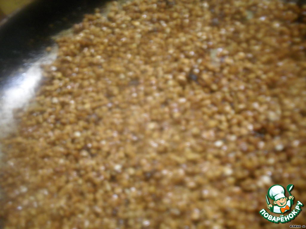 Гречневую крупу обжариваем на сливочном масле, постоянно помешивая, 1-2 минуты.