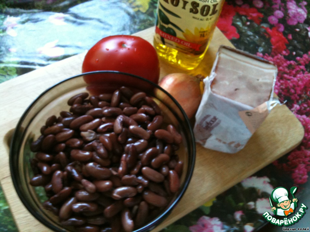 Это продукты, которые нам потребуются. Фасоль у меня замоченная на ночь и уже сваренная в течениии 1,5 часов. Иногда использую консервированную в собственном соку (если гости на пороге ;-)) Но консистенция и вкус варёной для меня, гораздо интереснее.