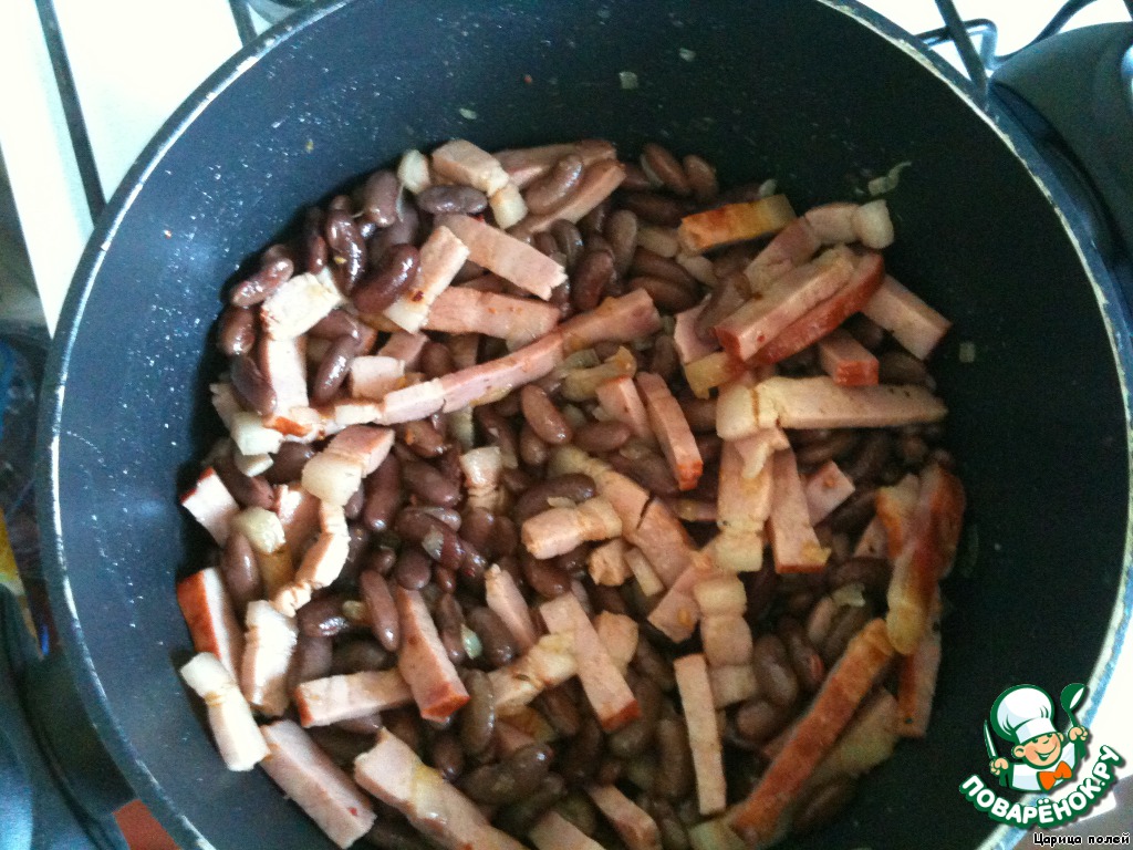 Теперь самое время посолить и добавить специи (у меня молотая паприка и "смесь перцев"). Говорят, что бобы "любят" сахар, поэтому всегда добавляю половинку чайной ложки сахарного песка.