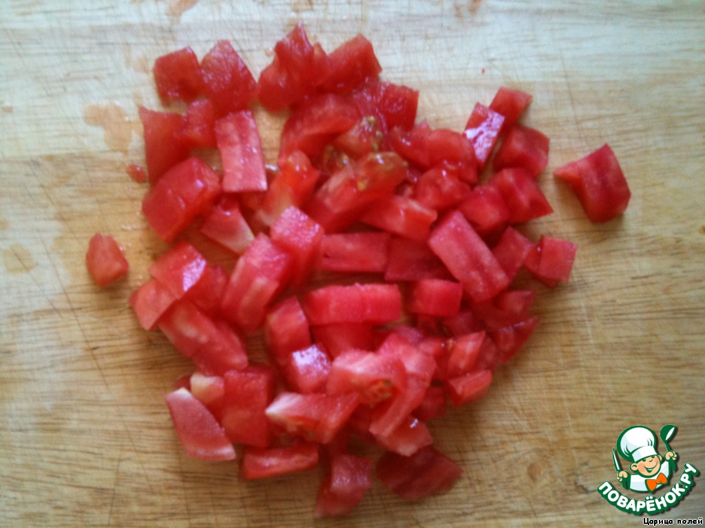 Пока тушится фасоль, помидор погрузим в кипяток на полминутки и снимем с него кожицу. Половину помидора порежем маленькими кубиками и добавим в фасоль.