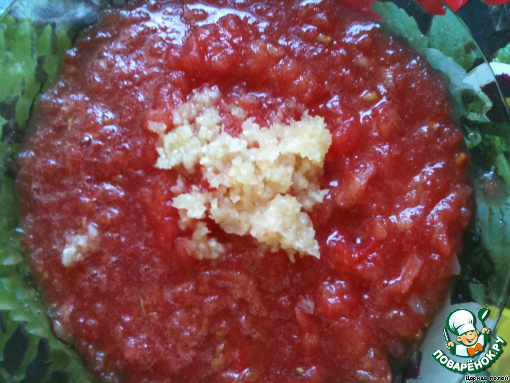 Вторую половинку помидора потрём на мелкой тёрке и выжмем через прес 2 зубчика чеснока.