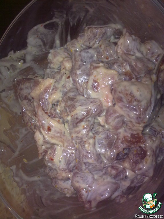 режем мясо, добавляем соевый соус, чесночный, приправки, оставляем на полчаса мариноваться