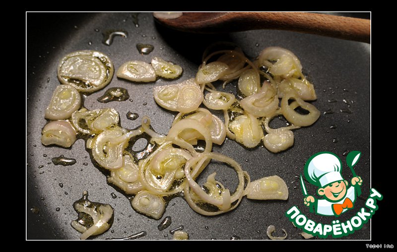 Разогреть оливковое масло и подрумянить в нeм тонко порезанный лук.