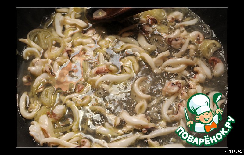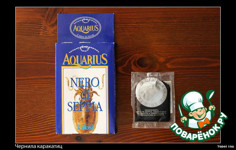 Жидкие чернила каракатицы разведeм в небольшом количестве белого вина. На 400 грамм муки (4 порции) потребуется 2 пакетика, на 200 грамм муки (2 порции) — один пакетик.