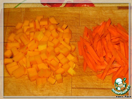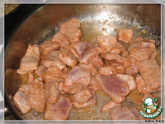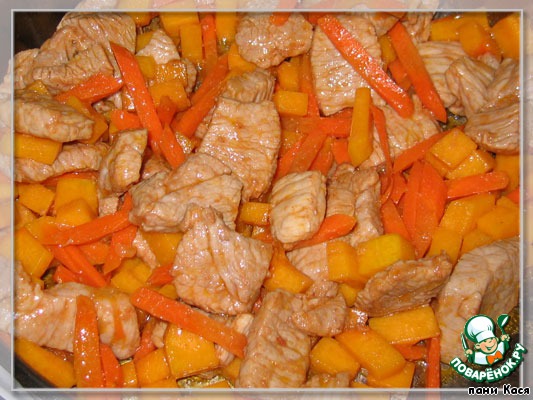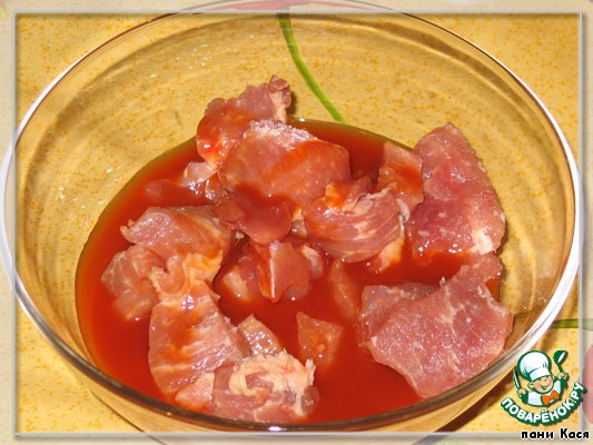 Свинину режем довольно мелкими брусочками (сравнимыми с тем, как будем резать тыкву и морковь), я нарезала крупновато, дорезала потом. Томатную пасту разводим до состояния сока (2-3 ложки пасты на стакан воды), оставляем четверть, остальным заливаем мясо, солим, перчим. Оставляем на какое-то время.