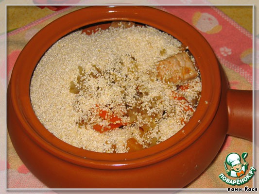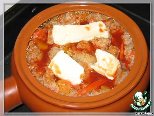 Перекладываем в горшочек, высыпаем крупу (прямо сухую)