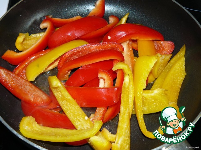 Сладкий перец нарезаем крупными кусочками (вдоль перца) и также быстро обжариваем на хорошо раскаленной сковороде. Отправляем к курице.