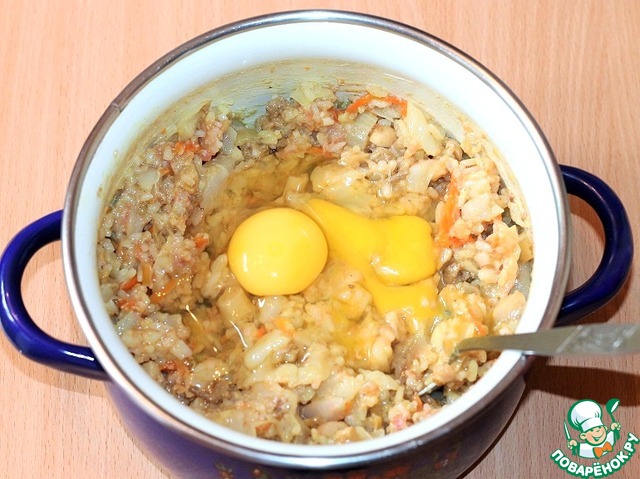 Выкладываем сюда же луково-морковную смесь с грибами и тщательно всё перемешиваем.