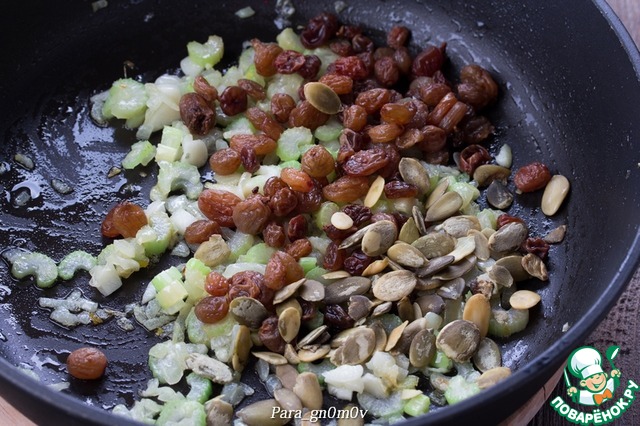 6. Добавить сельдерей, чеснок и готовить на среднем огне 5 минут, помешивая. Чуть посолить. Добавить изюм и тыквенные семечки. Готовить около минуты.