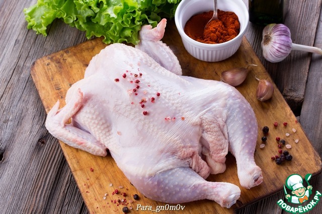 2. Пока варится рис, подготовить курицу. Курицу промыть, обсушить. Курицу повернуть на брюшко, сломать бедра у хребта. Подрезать позвоночник у хвоста. Аккуратно через брюшко, подрезая кожу и мясо вокруг кости, удалить позвоночную и грудную кость. Кости у курицы меня научила удалять Танюша chudo, сейчас всегда пользуюсь ее инструкцией. Вот здесь более подробно http://www.povarenok .ru/recipes/show/897 13/ Правда, в отличие от Таниной инструкции, бедра и ключичные кости я оставляю. Курицу еще раз промыть и обсушить.