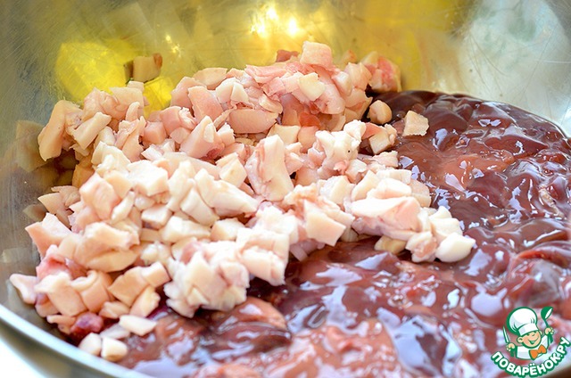 Сало и печень индейки нарежьте кубиками и сложите в одну глубокую миску.