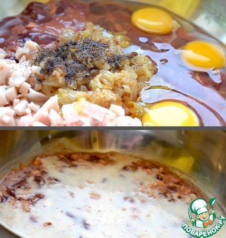 Лук обжарить до золотистого цвета в небольшом количестве растительного масла. Добавить его к печени и салу. Вбить 3 яйца и добавить выдавленный черeз пресс чеснок и специи. Размешать и влить молоко.