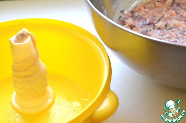Надеть череву на насадку для приготовления колбасы, с помощью мясорубки или вручную, как я, начинить их фаршем. Если у вас нет насадки, что делать. Я увиделa в интернете такую идею. Срезаете верхнюю часть пластиковой бутылки, на горлышко закрепляете череву, а в получившийся конус накладываете начинку.
