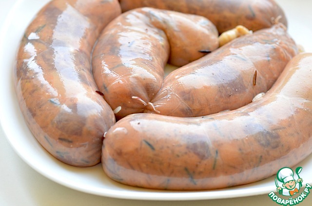 Очень важно не набить их туго, а самый верный способ - вполовину. Рис начнёт расти, впитывая все соки с печёнки, а черева, наоборот, сужаться. Завяжите концы и скрутите сардельки.