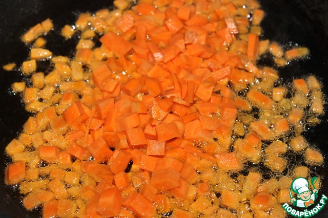 Морковь порезала кубиком и закинула обжариваться на растительном масле