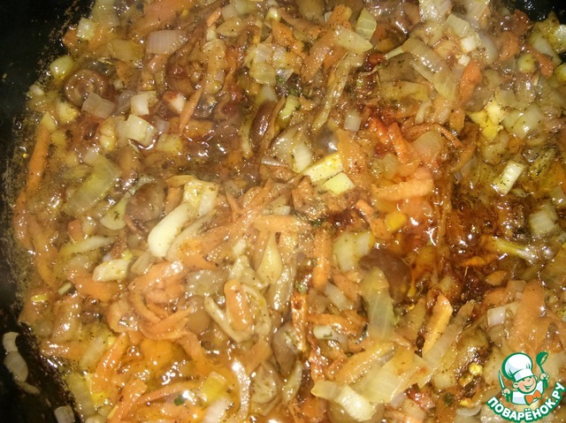 В обжаренное мясо добавляем фасоль, если она предварительно замочена, заливаем водой, чтобы покрыла. Если нет, то варим фасоль до увеличения в размере и добавляем мясо в фасоль. Варим 40 мин. В это время готовим заправку. На сливочном масле жарким грибы, до характерного грибного запаха, затем добавляем лук, морковь, чеснок и специи. Люблю остренькое, поэтому в специях не стеснялась. Вобщем, специи на Ваш вкус, я добавила: хмели-сунели, перец чёрный молотый, перец красный молотый, паприку.