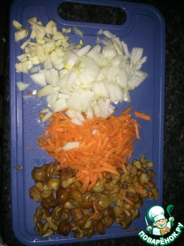 Режем мелко грибы, лук, чеснок и натираем на крупной терке морковь. По сезону, вместо грибов использую баклажаны.