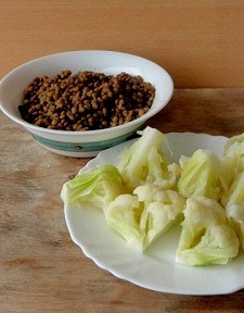 Чечевицу отварить согласно инструкции на упаковке. Цветную капусту отварить в воде или на пару с зубчиками чеснока, сделать пюре, посолить по вкусу, добавить мелко порезанную зелень кинзы.