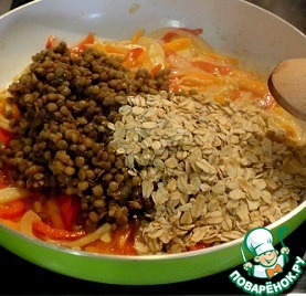 Лук и сельдерей мелко порубить и обжарить с морковью и болгарским перцем до мягкости. Добавить чечевицу, специи и соль по вкусу. Добавить хлопья-перемешать, огонь выключить.