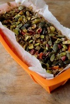 Оставшуюся неизмельченную часть использовать в качестве топпинга, смешав с семечками и нарубленными орехами. Выложить поверх капусты, хорошо примять.