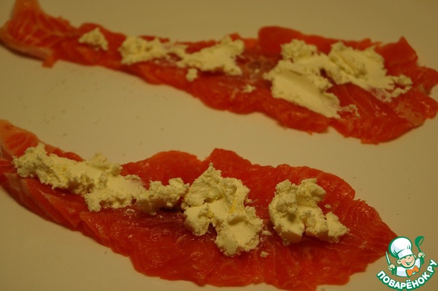 Итак. Берем два ломтика лосося. Я взяла просто один стейк, разрезала его пополам, а потом каждый кусочек прорезала посередине не до конца и развернула в стороны.