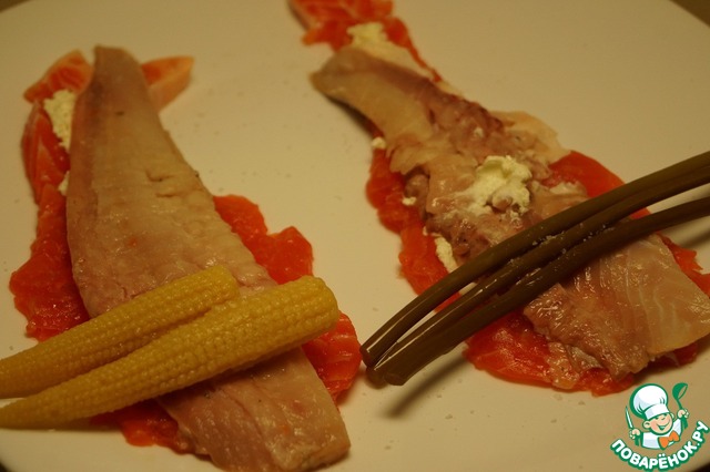 С камбалы снять филе и выложить на лосося. Посолить.