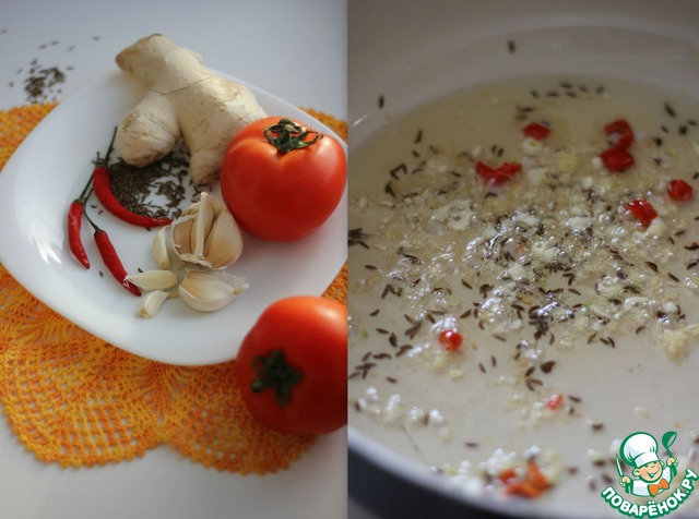 Теперь приготовим соус. Очистить от семян чили перец, порезать. Чеснок мелко нарубить. Имбирь протереть на терке. Очистить помидоры и порезать небольшими кубиками. Раскалить в сковороде масло. Добавить семена кумина (я использовала тмин), помешивая немного обжарить. Добавить чили перец, чеснок, имбирь, готовить 1-2 минуты на среднем огне. Добавить куркуму, соль, сахар, готовить ещё минуту.