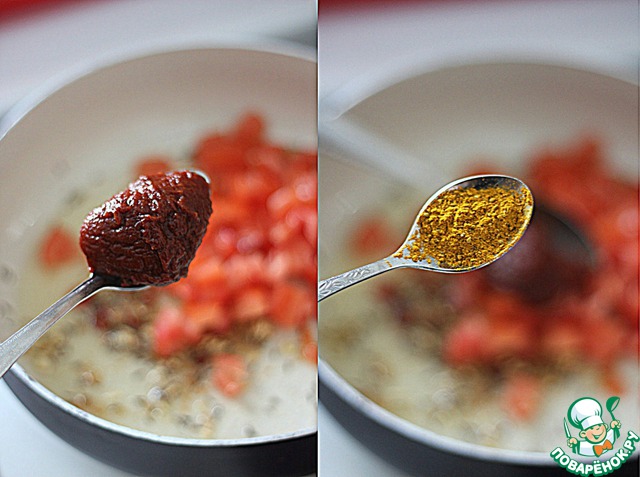 Добавить помидоры, томатную пасту, кари, готовить ещё 5 минут