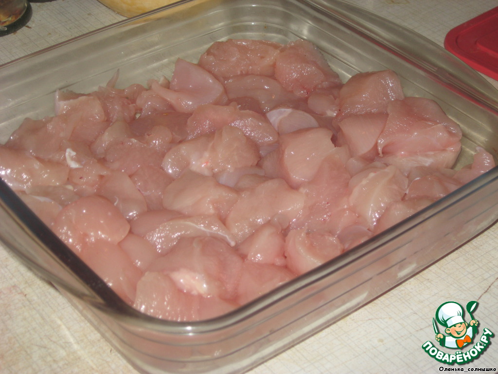 Куриное филе нарезаем небольшими кусочками и складываем в огнеупорную посуду.