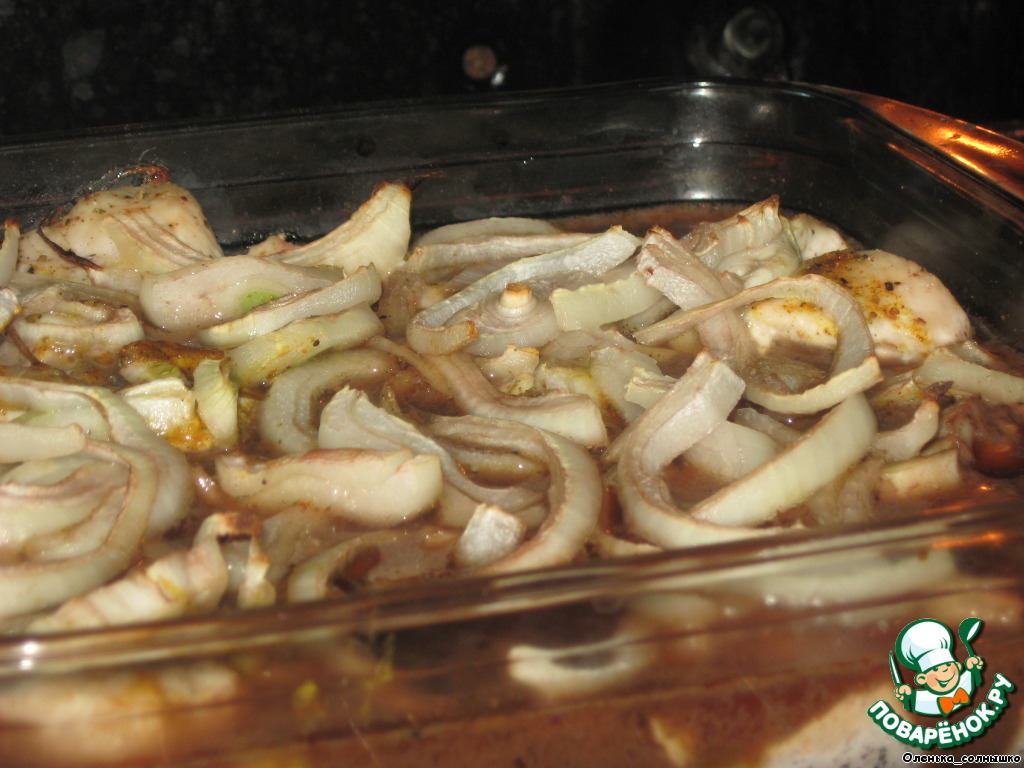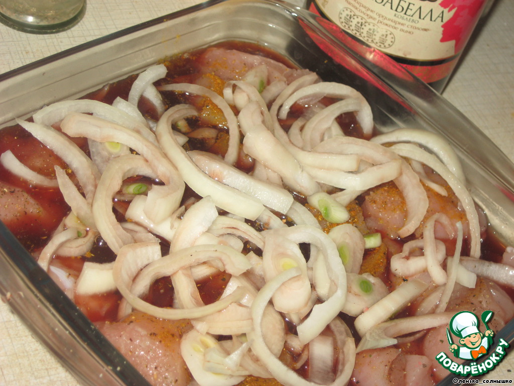 Посыпаем специями (у меня карри, смесь перцев, грибы сушеные с травами и морской солью), сверху выкладываем лук полукольцами и заливаем вином. Оставляем мариноваться хотя бы на пол часа, если вы делаете этот шаг, как я, сильно заранее, то накрываем пленкой или фольгой.