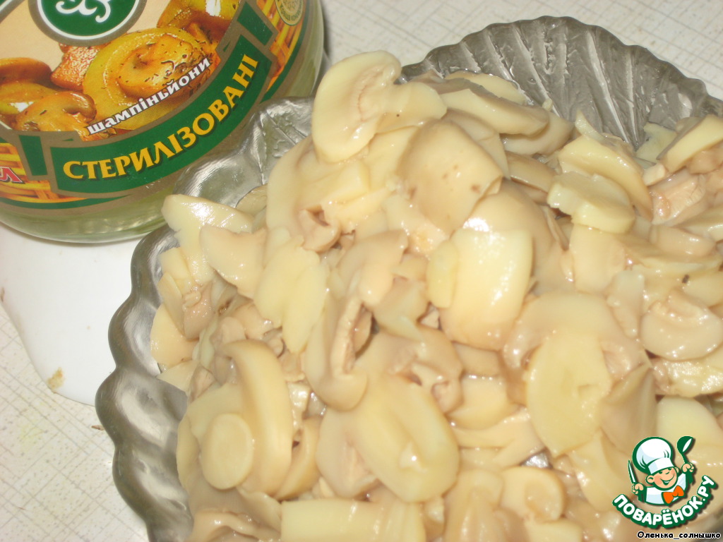Сверху выкладываем шампиньоны, если сырые, то предварительно нарезаем и обжариваем до мягкости, если такие как у меня, то сразу отправляем в горшочек.