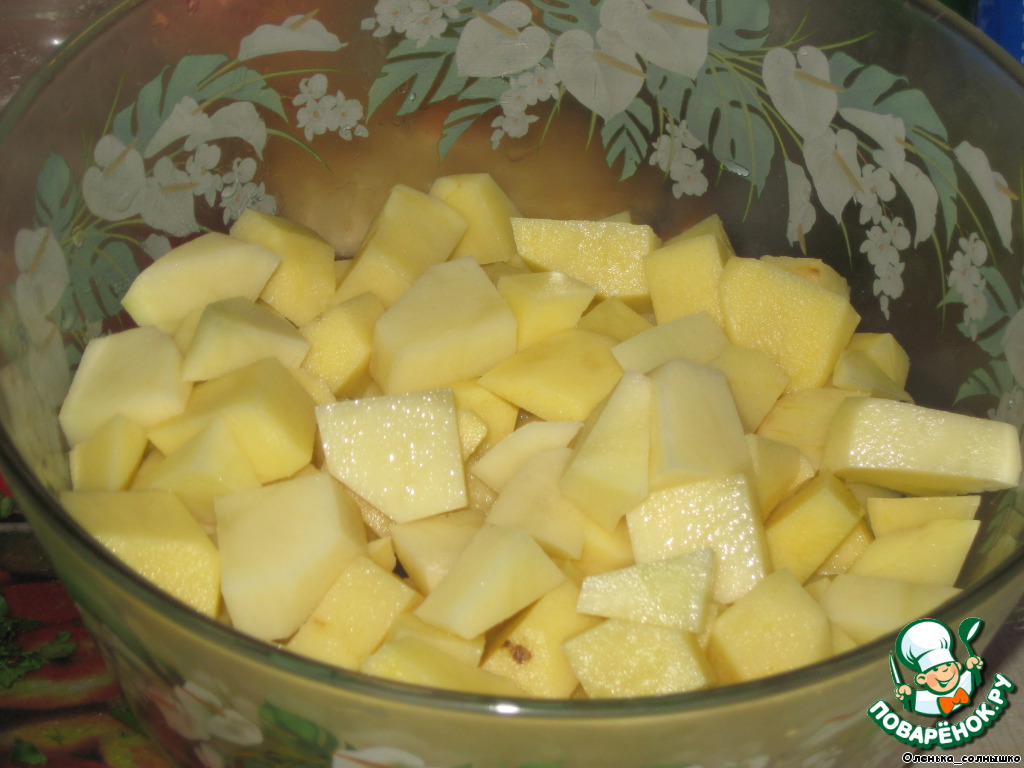 Далее выкладываем нарезанный кубиками картофель, если его заранее немного обжарить, то это сократит время приготовления в горшочках.