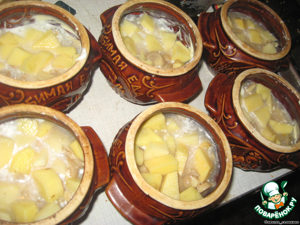 Распределяем по горшочкам подливу от курицы, и доливаем водой вровень с картошкой.