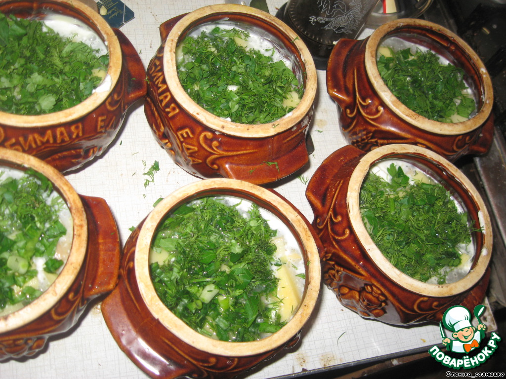 Замаринованную курочку отправляем в духовку на режим "гриль" примерно на 15 минут, если гриля нет, то обжариваем немного на сковороде и выкладываем в смазанные сливочным маслом горшочки (можно готовить в большом горшке или утятнице).