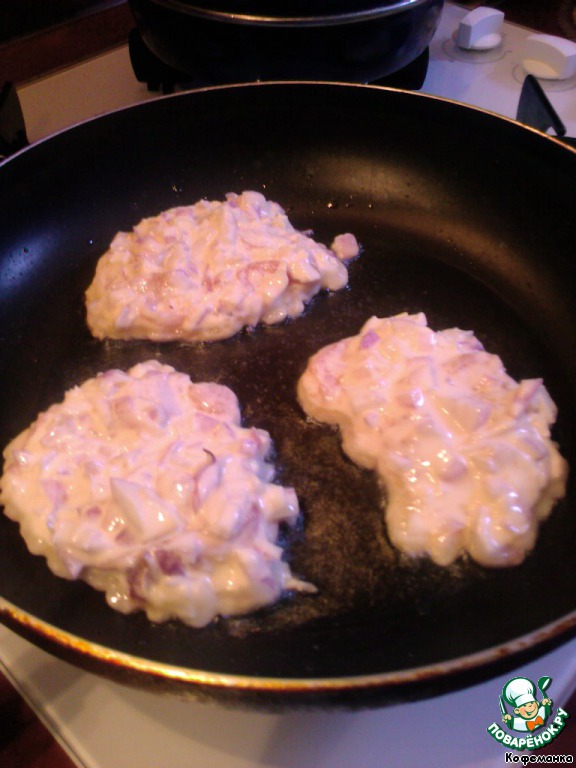 Собственно, подготовка уже закончилась! Теперь окунаем наши отбивнушки в луковую шубку, да не скупимся! Можно прямо накладывать луковый кляр на мяско. Обжариваем отбивные на растительном маслице.