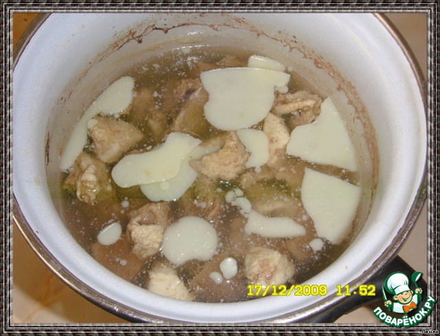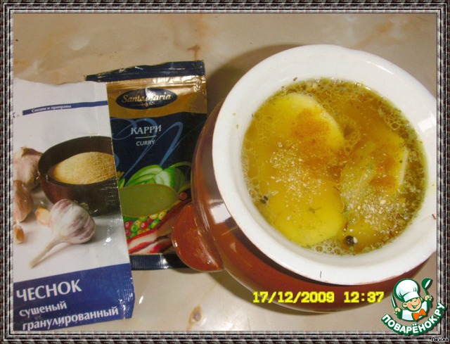 Налить сверху процеженный бульон от мяса, по желанию - чеснок, карри.