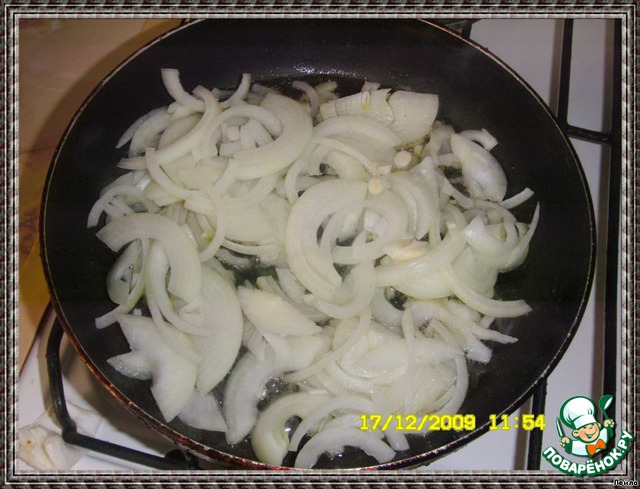 Лук нашинковать, обжарить в масле, чтобы сократить количество масла, положила жир из отварного мяса.