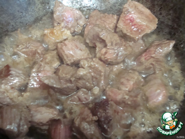 Мясо порезать порционными кусками. В казане разогреть растительное масло и обжарить в нем мясо.