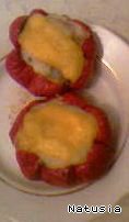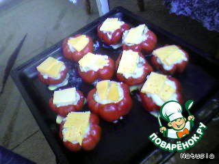 Смешиваем пюре с грибочками, фаршируем этим наши перцы, противень смазываем маслом, выкладываем перчики, сверху кладем по кусочку сыра. Ставим в духовку( темп. 200-220 градусов), запекаем минут 30-40.