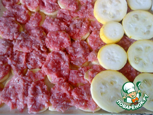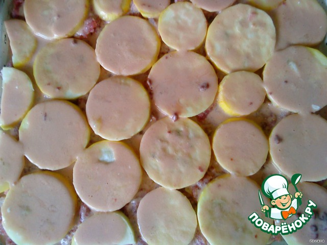на картошку кладём фарш. На фарш выкладываем кабачки