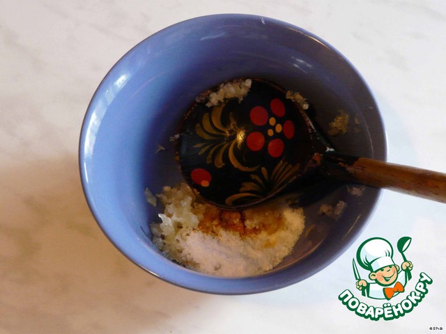 Чеснок подавить, перемешать с солью и специями