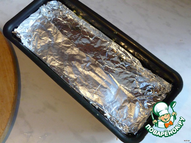 Последний, верхний слой - пюре. Закрываем фольгой. Запекаем в духовке на водяной бане 30 минут при температуре 180 градусов, (если не уверены в качестве бани или в низкой температуре, то лучше запекать с грузиком). Остужаем его под грузом, затем в холодильник на ночь, грузик снимаем утром.
