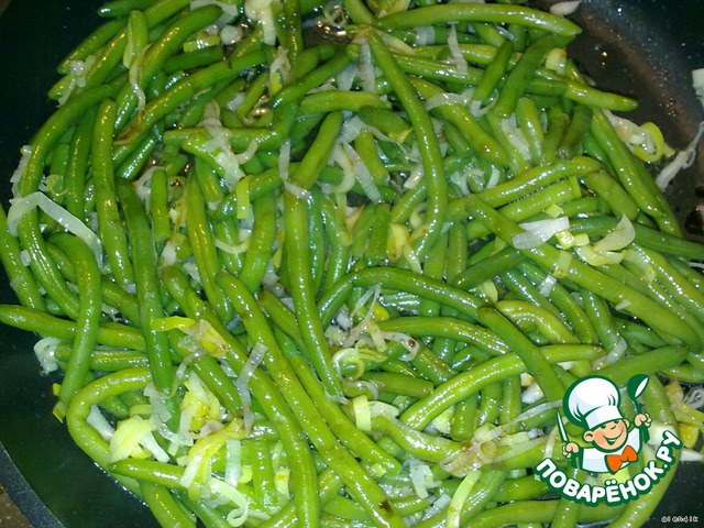 Добавить фасоль и, помешивая, обжаривать примерно 2 минуты.