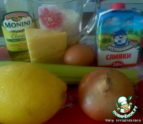 Вот исходные продукты, кроме сливочного масла и бульона. Рис для ризотто обычно используют Арборио, но у меня был Японика, он тоже круглозерный. Сыр по оригинльному рецепту - пармезан, но я взяла обычный твердый сыр.