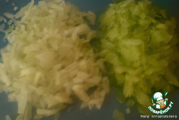 Мелко нарезаем лук и стебель сельдерея и обжариваем на сковороде, разогретой с оливковым и сливочным маслом до прозрачности лука (минут 5-6).