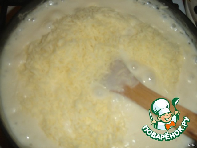 Добавьте в соус половину тертого сыра и перемешайте. Приправьте по вкусу (соль, перец). Снимите с огня.