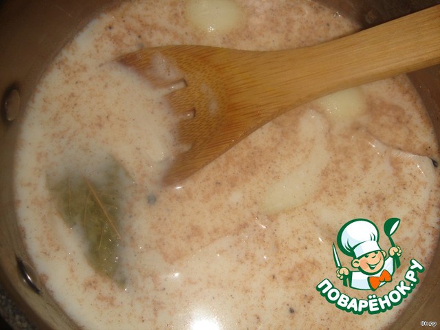 Пассеровку снять с огня и осторожно порциями ввести в нее горячее пряное процеженное молоко, постоянно взбивая пассеровку.