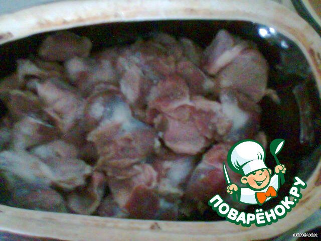 Желудки положить в горшочек, добавить соль, перец, чеснок, лаврушку. Залить все это водой до половины горшочка.